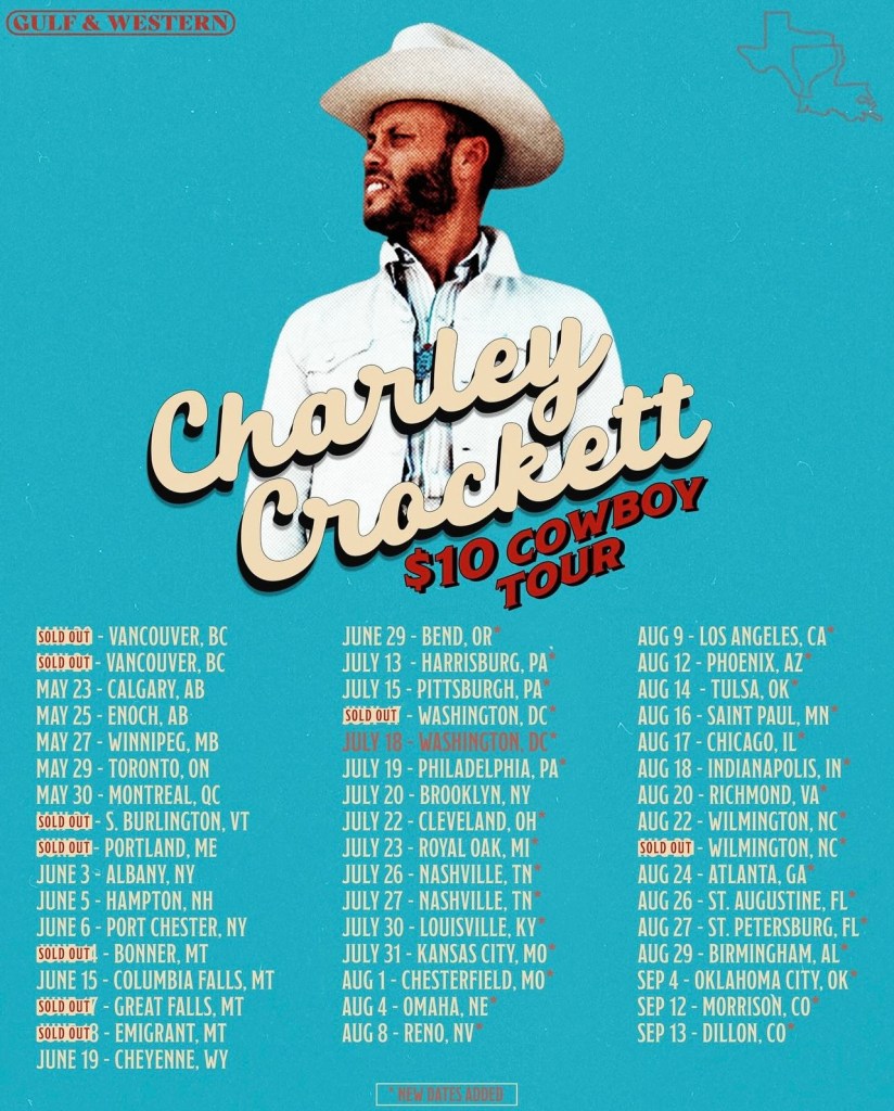Charley Crockett’s $10 Cowboy tour kicks off this month, with shows lined up all the way through September. Secure your tickets now! You won’t want to miss this Texas troubadour!